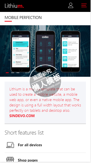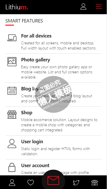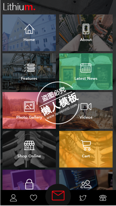 模板简介:该模板名称为【lithium多彩透明背景触屏版自适应html5手机wap网站模板源码下载】,大小是,文档格式为.,推荐使用打开,作品中的图片,文字等数据均可修改,图片请在作品中选中图片替换即可,文字修改直接点击文字修改即可,您也可以新增或修改作品中的内容,该模板来自用户分享,如有侵权行为请联系网站客服处理。欢迎来懒人模板【HTML5】栏目查找您需要的精美模板。