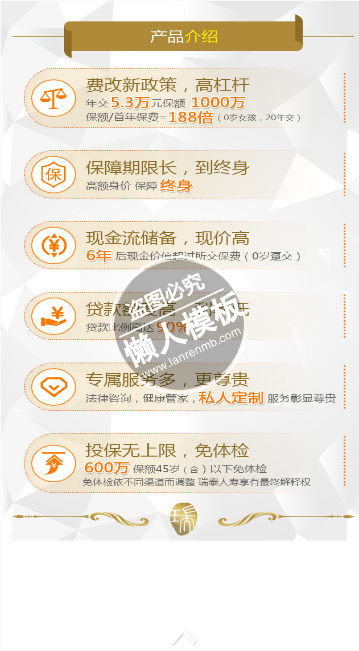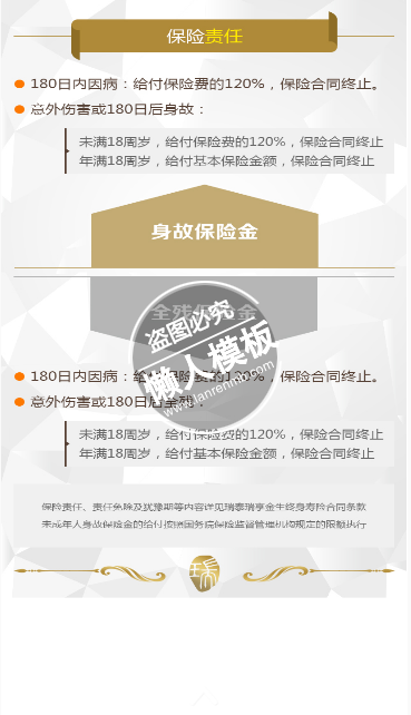 模板简介:该模板名称为【瑞享人寿保险html5手机专题单页网站模板源码下载】,大小是,文档格式为.,推荐使用打开,作品中的图片,文字等数据均可修改,图片请在作品中选中图片替换即可,文字修改直接点击文字修改即可,您也可以新增或修改作品中的内容,该模板来自用户分享,如有侵权行为请联系网站客服处理。欢迎来懒人模板【单页】栏目查找您需要的精美模板。