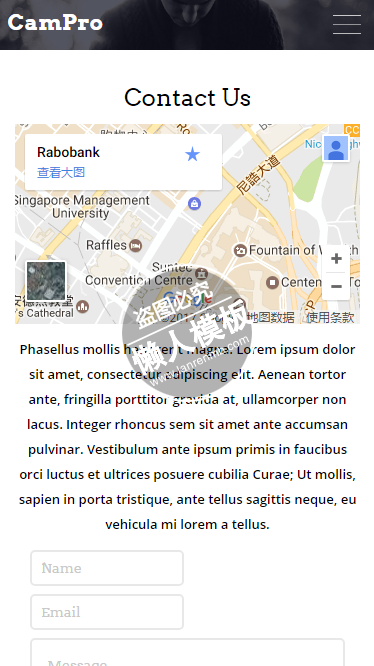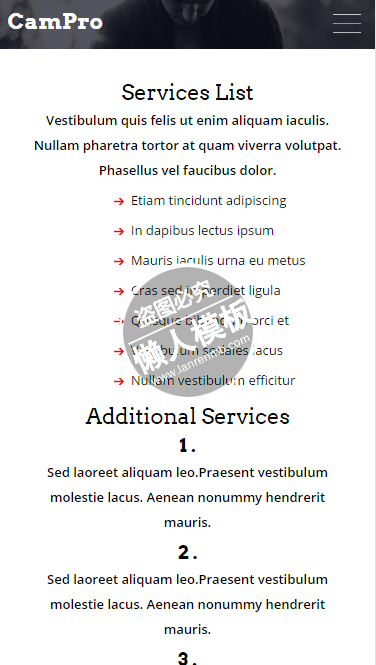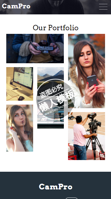 模板简介:该模板名称为【CamPro个人摄影工作室自适应html5手机wap网站模板源码下载】,大小是,文档格式为.,推荐使用打开,作品中的图片,文字等数据均可修改,图片请在作品中选中图片替换即可,文字修改直接点击文字修改即可,您也可以新增或修改作品中的内容,该模板来自用户分享,如有侵权行为请联系网站客服处理。欢迎来懒人模板【个人】栏目查找您需要的精美模板。