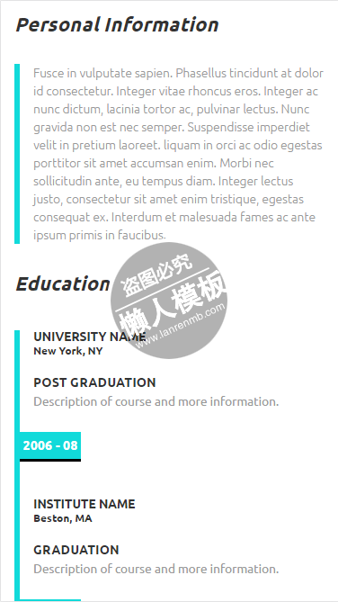 模板简介:该模板名称为【Curriculum个人工作室html5手机wap网站模板源码下载】,大小是,文档格式为.,推荐使用打开,作品中的图片,文字等数据均可修改,图片请在作品中选中图片替换即可,文字修改直接点击文字修改即可,您也可以新增或修改作品中的内容,该模板来自用户分享,如有侵权行为请联系网站客服处理。欢迎来懒人模板【个人】栏目查找您需要的精美模板。