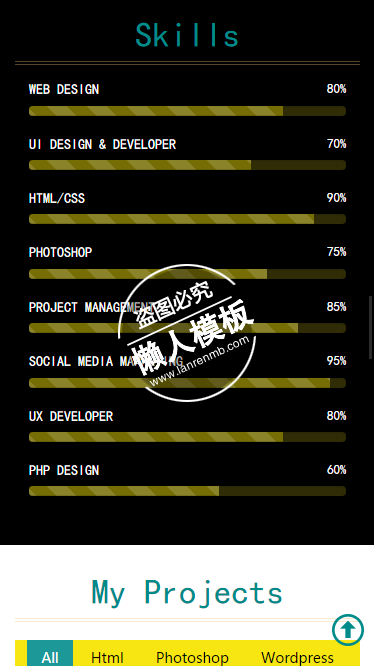 模板简介:该模板名称为【My Resume网络设计html5手机wap个人简历工作室网站模板源码下载】,大小是,文档格式为.,推荐使用打开,作品中的图片,文字等数据均可修改,图片请在作品中选中图片替换即可,文字修改直接点击文字修改即可,您也可以新增或修改作品中的内容,该模板来自用户分享,如有侵权行为请联系网站客服处理。欢迎来懒人模板【个人】栏目查找您需要的精美模板。