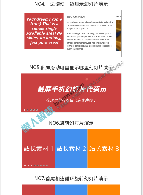 模板简介:该模板名称为【手机触屏版幻灯片特效代码下载】,大小是,文档格式为.,推荐使用打开,作品中的图片,文字等数据均可修改,图片请在作品中选中图片替换即可,文字修改直接点击文字修改即可,您也可以新增或修改作品中的内容,该模板来自用户分享,如有侵权行为请联系网站客服处理。欢迎来懒人模板【焦点图】栏目查找您需要的精美模板。