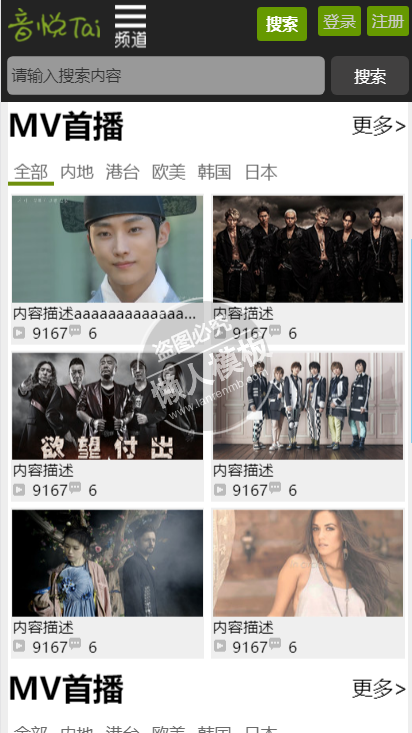 模板简介:该模板名称为【手机纯原生JS-音悦台移动端首页框架js特效下载】,大小是,文档格式为.,推荐使用打开,作品中的图片,文字等数据均可修改,图片请在作品中选中图片替换即可,文字修改直接点击文字修改即可,您也可以新增或修改作品中的内容,该模板来自用户分享,如有侵权行为请联系网站客服处理。欢迎来懒人模板【前端框架】栏目查找您需要的精美模板。