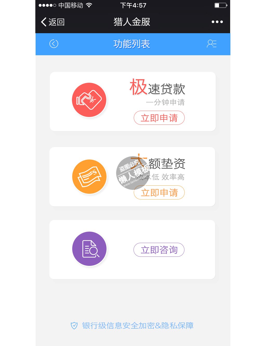 模板简介:该模板名称为【猎人金服垫资申请ui界面设计移动端手机网页psd素材下载】,大小是,文档格式为.,推荐使用打开,作品中的图片,文字等数据均可修改,图片请在作品中选中图片替换即可,文字修改直接点击文字修改即可,您也可以新增或修改作品中的内容,该模板来自用户分享,如有侵权行为请联系网站客服处理。欢迎来懒人模板【登录页】栏目查找您需要的精美模板。