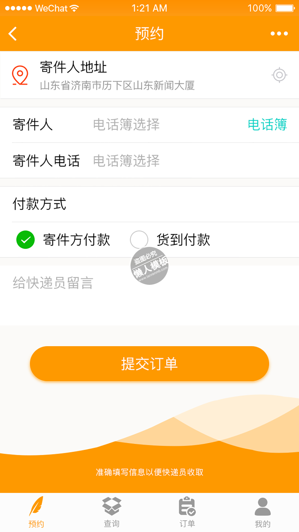 模板简介:该模板名称为【橙色快递小程序寄件人提交页面ui界面设计移动端手机psd素材下载】,大小是,文档格式为.,推荐使用打开,作品中的图片,文字等数据均可修改,图片请在作品中选中图片替换即可,文字修改直接点击文字修改即可,您也可以新增或修改作品中的内容,该模板来自用户分享,如有侵权行为请联系网站客服处理。欢迎来懒人模板【小程序】栏目查找您需要的精美模板。
