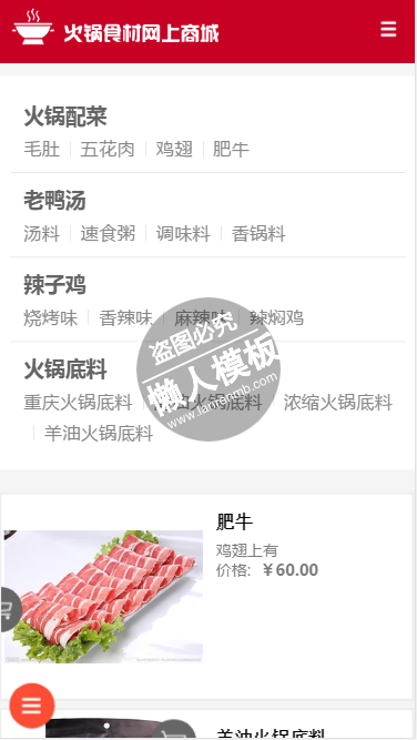 模板简介:该模板名称为【火锅食材网上商城触屏版手机wap网店系统制作网站模板免费下载】,大小是,文档格式为.,推荐使用打开,作品中的图片,文字等数据均可修改,图片请在作品中选中图片替换即可,文字修改直接点击文字修改即可,您也可以新增或修改作品中的内容,该模板来自用户分享,如有侵权行为请联系网站客服处理。欢迎来懒人模板【网店】栏目查找您需要的精美模板。
