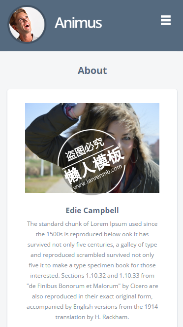 模板简介:该模板名称为【Animus Blogging html5手机wap学生个人博客网站模板源码下载】,大小是,文档格式为.,推荐使用打开,作品中的图片,文字等数据均可修改,图片请在作品中选中图片替换即可,文字修改直接点击文字修改即可,您也可以新增或修改作品中的内容,该模板来自用户分享,如有侵权行为请联系网站客服处理。欢迎来懒人模板【微博】栏目查找您需要的精美模板。
