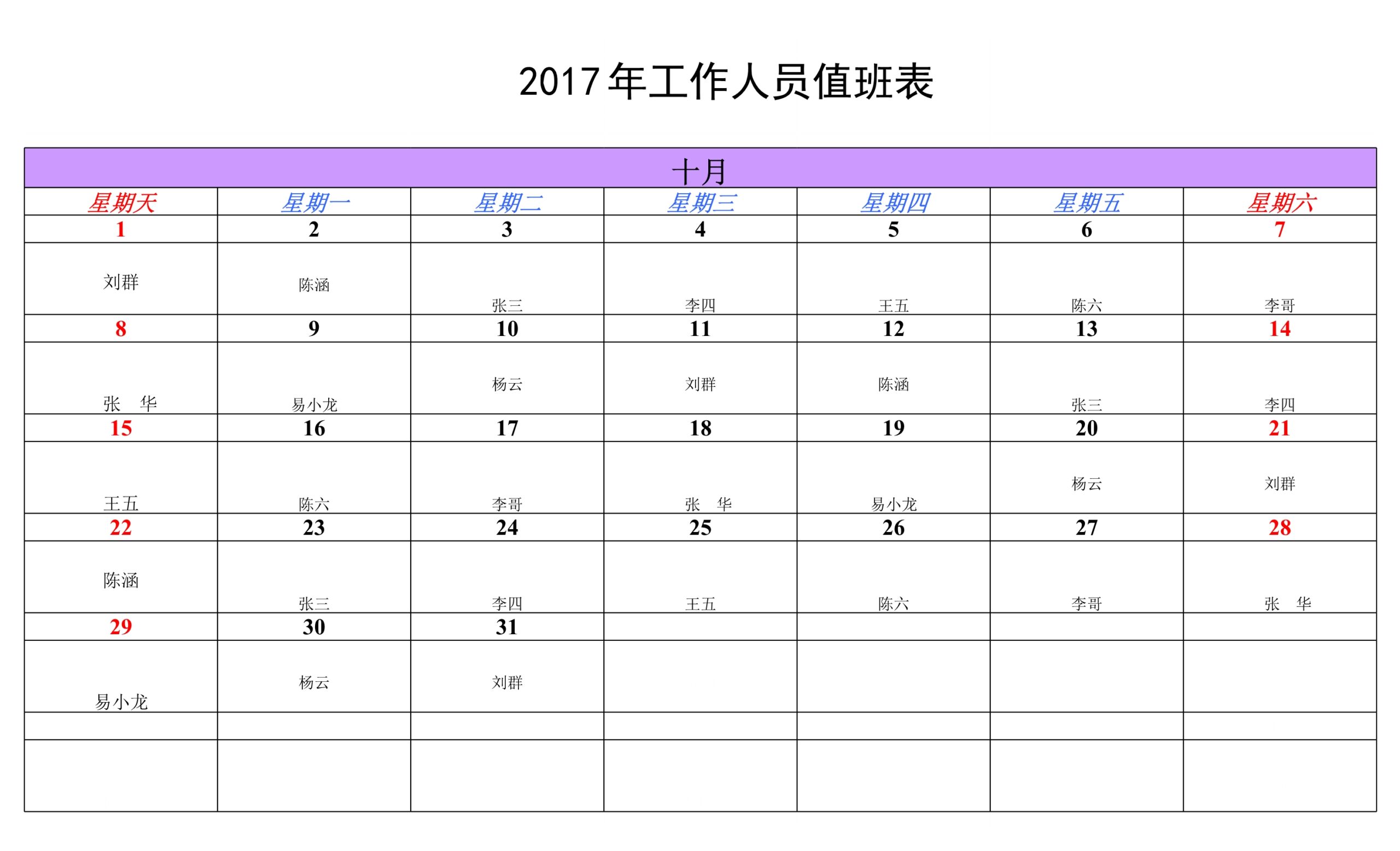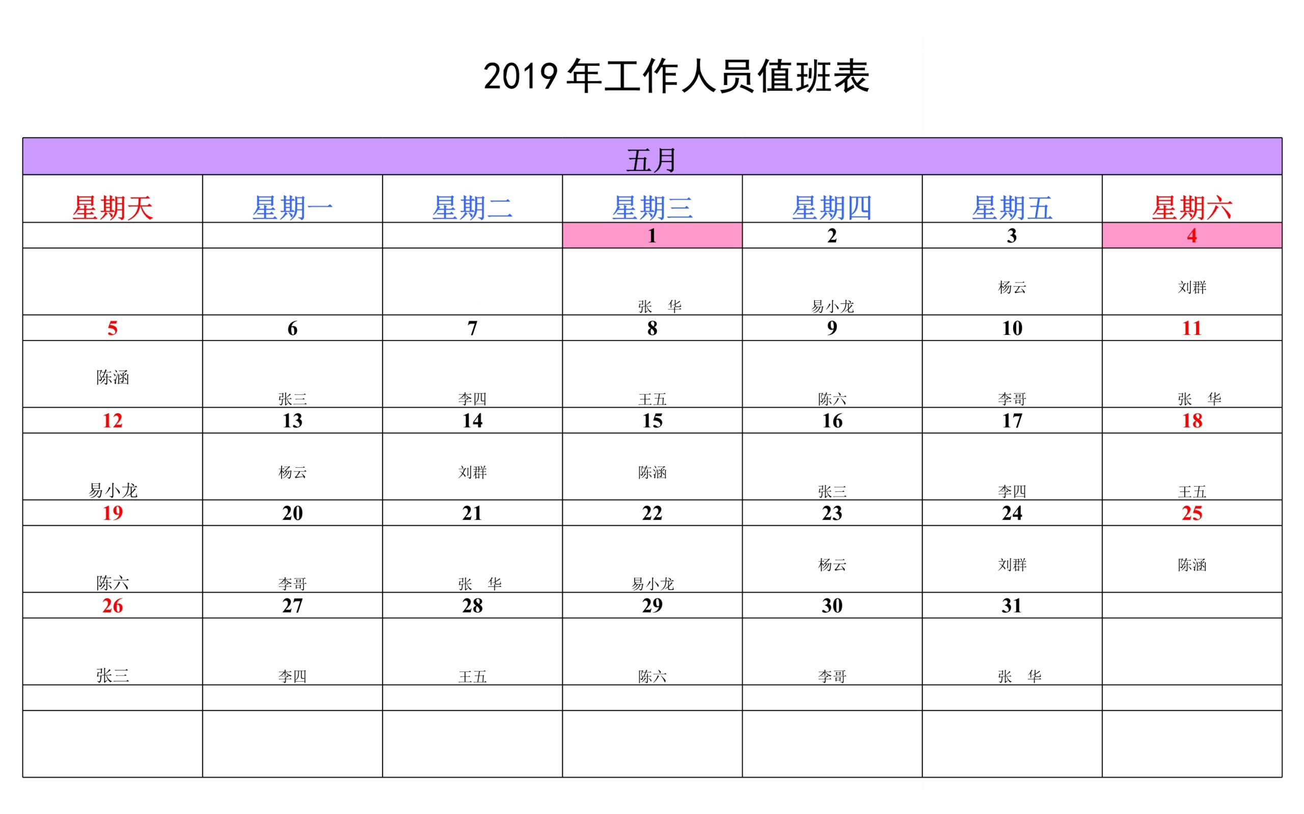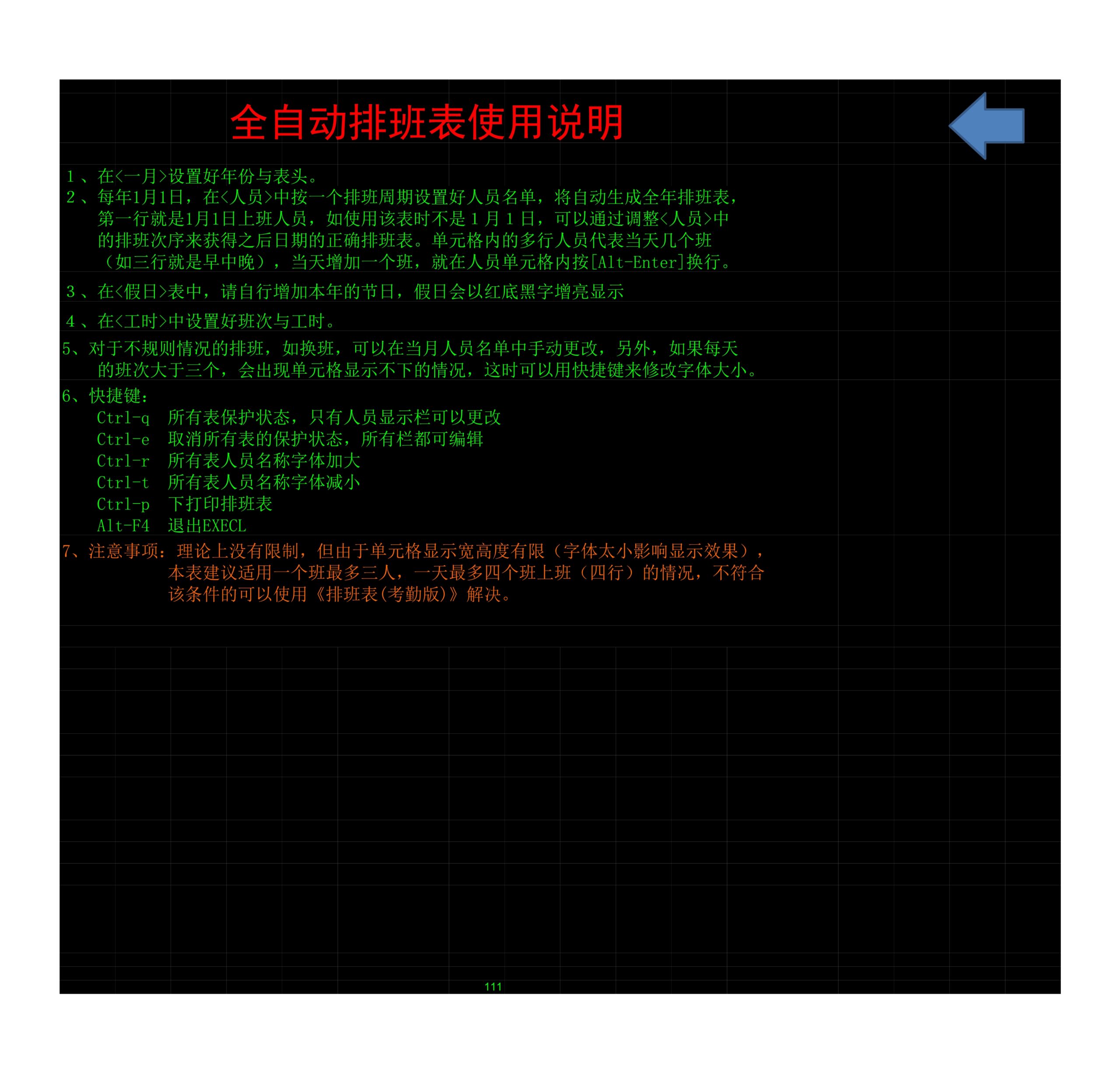 模板简介:该模板名称为【自动生成全年排班表Excle表格样本模板免费下载】,大小是257.50 KB,文档格式为.xls,推荐使用Microsoft Excel/WPS打开,作品中的图片,文字等数据均可修改,图片请在作品中选中图片替换即可,文字修改直接点击文字修改即可,您也可以新增或修改作品中的内容,该模板来自用户分享,如有侵权行为请联系网站客服处理。欢迎来懒人模板【人事管理,可视化图表】栏目查找您需要的精美模板。