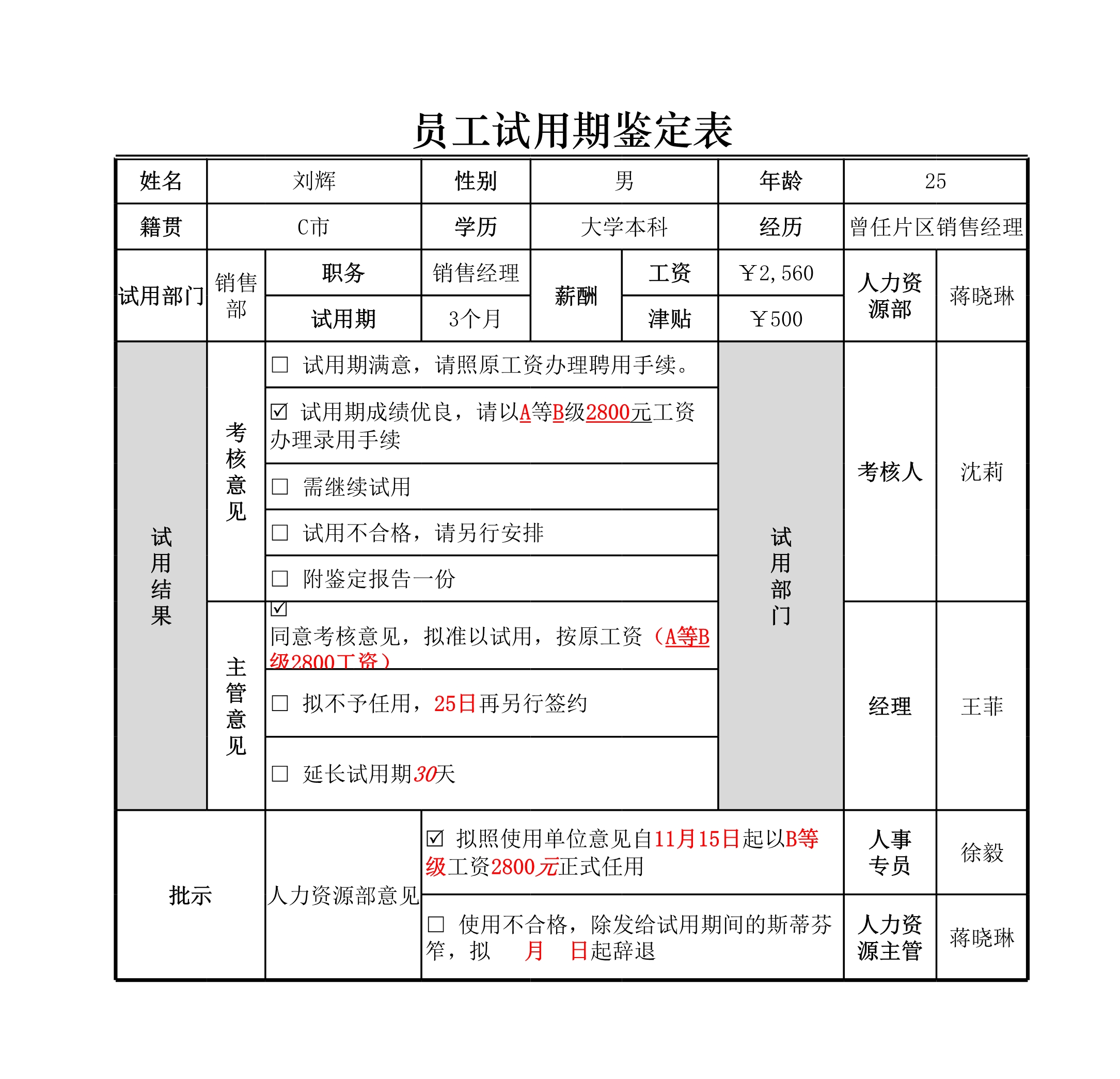 模板简介:该模板名称为【人员试用期鉴定表Excle表格样本模板免费下载】,大小是11.10 KB,文档格式为.xls,推荐使用Microsoft Excel/WPS打开,作品中的图片,文字等数据均可修改,图片请在作品中选中图片替换即可,文字修改直接点击文字修改即可,您也可以新增或修改作品中的内容,该模板来自用户分享,如有侵权行为请联系网站客服处理。欢迎来懒人模板【人事管理】栏目查找您需要的精美模板。