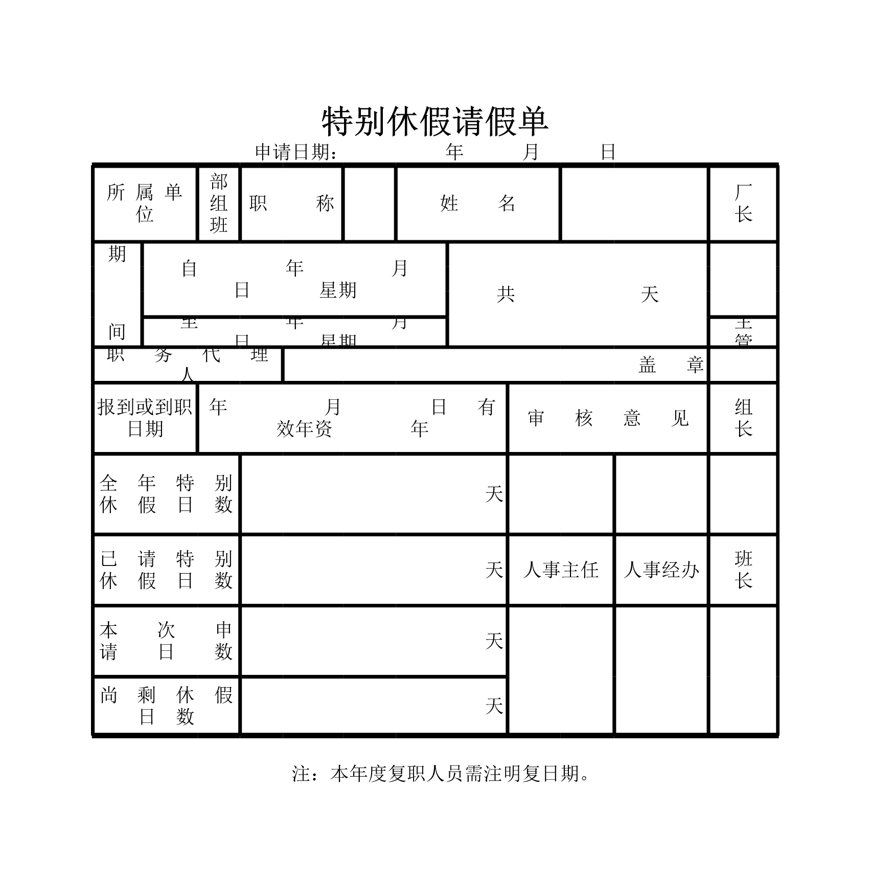 模板简介:该模板名称为【特别休假请假单Excle表格样本模板免费下载】,大小是11.71 KB,文档格式为.XLS,推荐使用Microsoft Excel/WPS打开,作品中的图片,文字等数据均可修改,图片请在作品中选中图片替换即可,文字修改直接点击文字修改即可,您也可以新增或修改作品中的内容,该模板来自用户分享,如有侵权行为请联系网站客服处理。欢迎来懒人模板【人事管理】栏目查找您需要的精美模板。