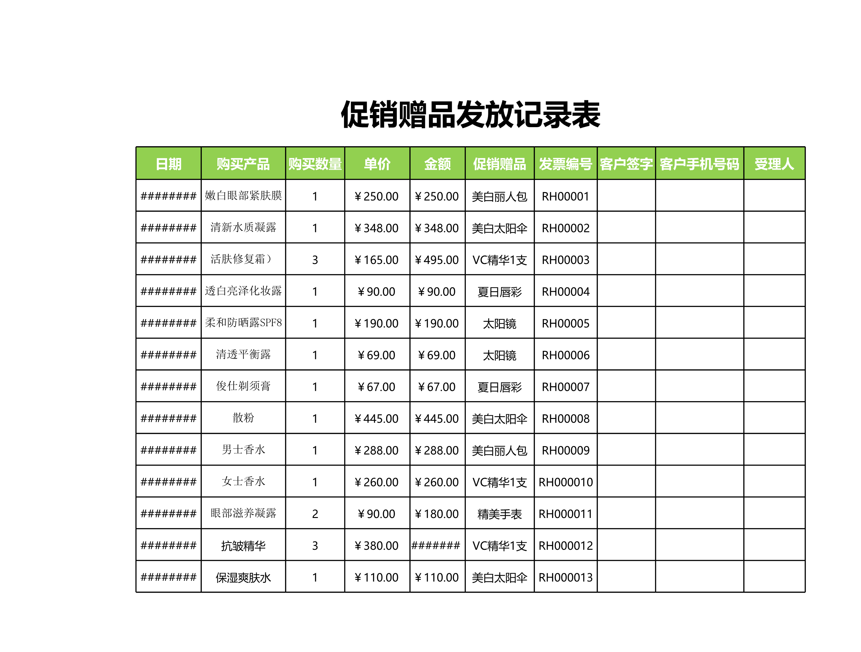 模板简介:该模板名称为【发放赠品记录单Excle表格样本模板免费下载】,大小是13.61 KB,文档格式为.xls,推荐使用Microsoft Excel/WPS打开,作品中的图片,文字等数据均可修改,图片请在作品中选中图片替换即可,文字修改直接点击文字修改即可,您也可以新增或修改作品中的内容,该模板来自用户分享,如有侵权行为请联系网站客服处理。欢迎来懒人模板【行政管理】栏目查找您需要的精美模板。