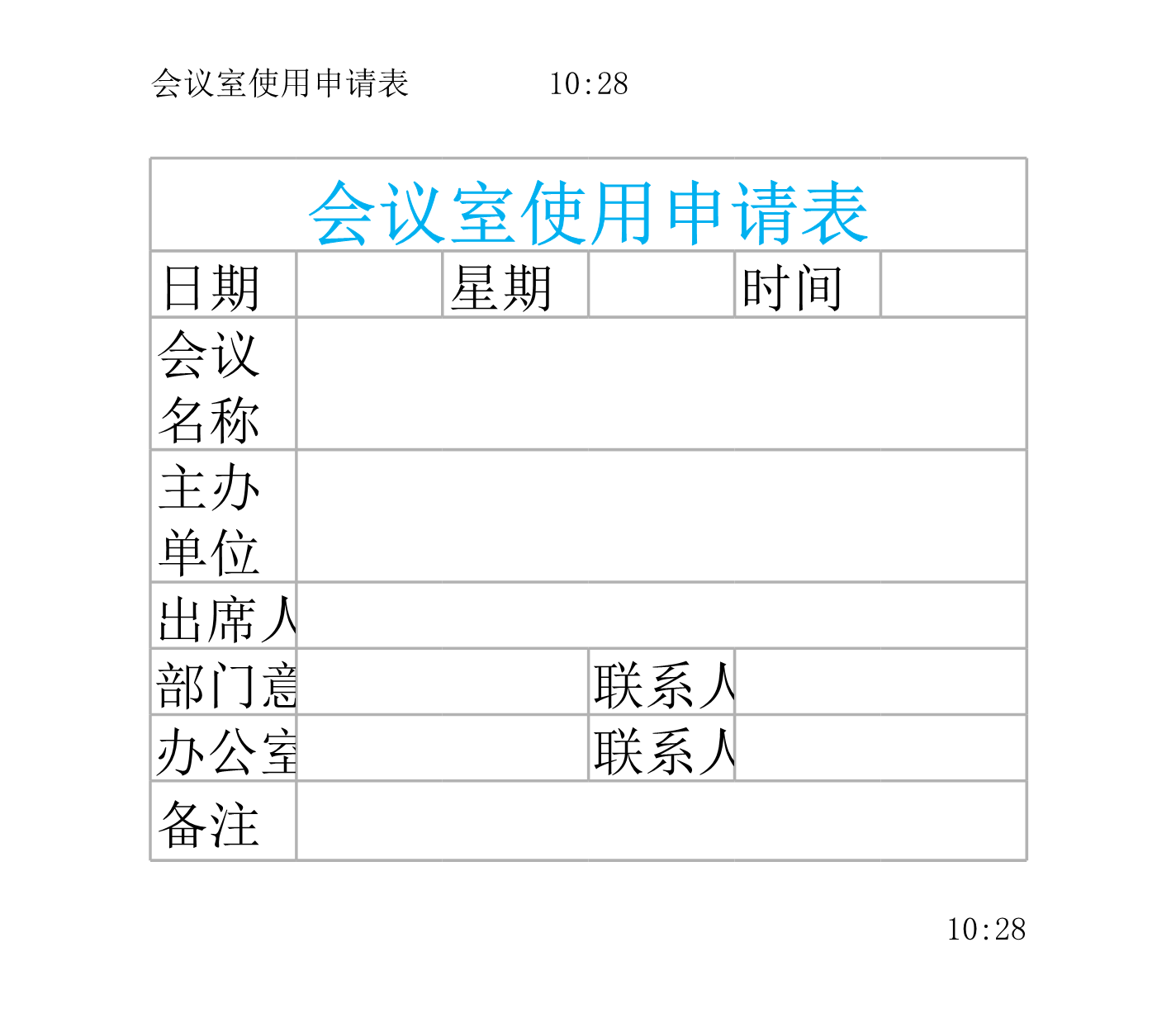 模板简介:该模板名称为【会议室使用申请表Excle表格样本模板免费下载】,大小是12.45 KB,文档格式为.XLS,推荐使用Microsoft Excel/WPS打开,作品中的图片,文字等数据均可修改,图片请在作品中选中图片替换即可,文字修改直接点击文字修改即可,您也可以新增或修改作品中的内容,该模板来自用户分享,如有侵权行为请联系网站客服处理。欢迎来懒人模板【行政管理】栏目查找您需要的精美模板。