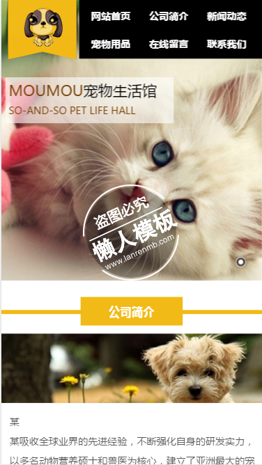 模板简介:该模板名称为【萌宠成活触屏版手机wap宠物网站模板下载】,大小是,文档格式为.,推荐使用打开,作品中的图片,文字等数据均可修改,图片请在作品中选中图片替换即可,文字修改直接点击文字修改即可,您也可以新增或修改作品中的内容,该模板来自用户分享,如有侵权行为请联系网站客服处理。欢迎来懒人模板【宠物】栏目查找您需要的精美模板。