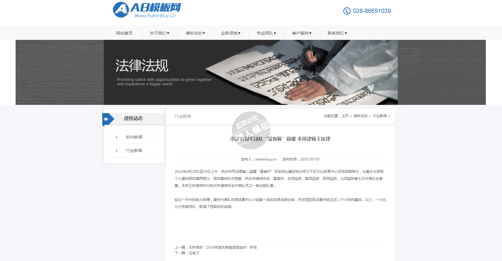 模板简介:该模板名称为【清爽简约大气律师事务所网站整站带织梦后台pc网站源码下载】,大小是,文档格式为.,推荐使用打开,作品中的图片,文字等数据均可修改,图片请在作品中选中图片替换即可,文字修改直接点击文字修改即可,您也可以新增或修改作品中的内容,该模板来自用户分享,如有侵权行为请联系网站客服处理。欢迎来懒人模板【法律】栏目查找您需要的精美模板。
