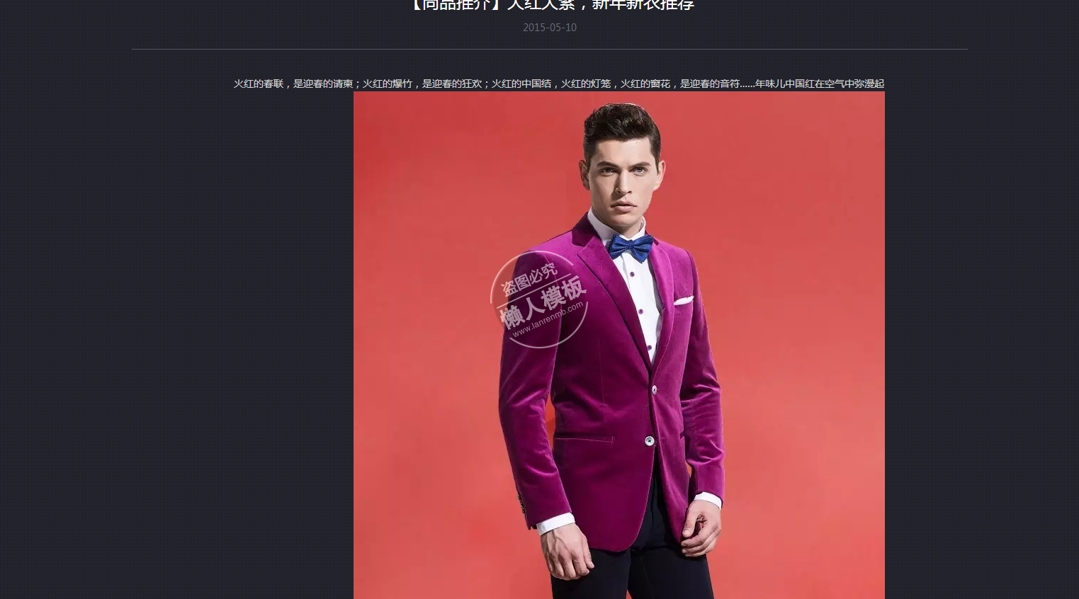 模板简介:该模板名称为【爵度礼宾服饰服装网站整站带织梦后台pc网站源码下载】,大小是,文档格式为.,推荐使用打开,作品中的图片,文字等数据均可修改,图片请在作品中选中图片替换即可,文字修改直接点击文字修改即可,您也可以新增或修改作品中的内容,该模板来自用户分享,如有侵权行为请联系网站客服处理。欢迎来懒人模板【服装】栏目查找您需要的精美模板。