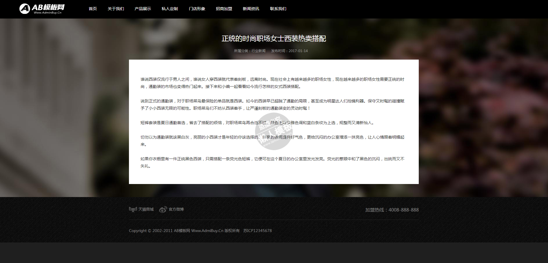模板简介:该模板名称为【国人西装服饰类网站整站带织梦后台pc网站源码下载】,大小是,文档格式为.,推荐使用打开,作品中的图片,文字等数据均可修改,图片请在作品中选中图片替换即可,文字修改直接点击文字修改即可,您也可以新增或修改作品中的内容,该模板来自用户分享,如有侵权行为请联系网站客服处理。欢迎来懒人模板【服装】栏目查找您需要的精美模板。