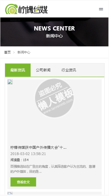 模板简介:该模板名称为【柠檬传媒公司手机PC端自适应响应式html5企业网站双模板下载】,大小是,文档格式为.,推荐使用打开,作品中的图片,文字等数据均可修改,图片请在作品中选中图片替换即可,文字修改直接点击文字修改即可,您也可以新增或修改作品中的内容,该模板来自用户分享,如有侵权行为请联系网站客服处理。欢迎来懒人模板【广告】栏目查找您需要的精美模板。