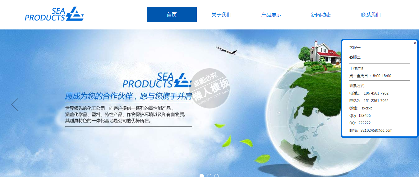 模板简介:该模板名称为【Sea products化工自适应响应式化工网站双模板下载】,大小是,文档格式为.,推荐使用打开,作品中的图片,文字等数据均可修改,图片请在作品中选中图片替换即可,文字修改直接点击文字修改即可,您也可以新增或修改作品中的内容,该模板来自用户分享,如有侵权行为请联系网站客服处理。欢迎来懒人模板【化工】栏目查找您需要的精美模板。