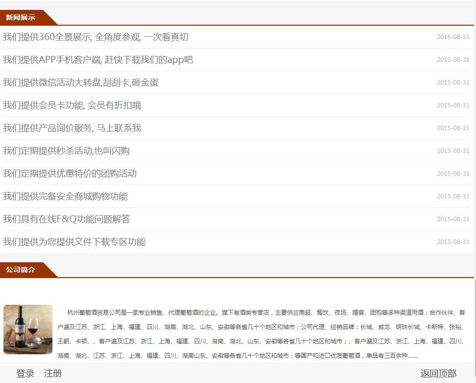 模板简介:该模板名称为【杭州葡萄酒贸易公司自适应响应式网站模板素材免费下载】,大小是,文档格式为.,推荐使用打开,作品中的图片,文字等数据均可修改,图片请在作品中选中图片替换即可,文字修改直接点击文字修改即可,您也可以新增或修改作品中的内容,该模板来自用户分享,如有侵权行为请联系网站客服处理。欢迎来懒人模板【酿造】栏目查找您需要的精美模板。