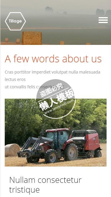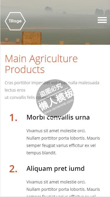 模板简介:该模板名称为【Tillage大图文字切换村庄html5手机农业企业网站模板免费下载】,大小是,文档格式为.,推荐使用打开,作品中的图片,文字等数据均可修改,图片请在作品中选中图片替换即可,文字修改直接点击文字修改即可,您也可以新增或修改作品中的内容,该模板来自用户分享,如有侵权行为请联系网站客服处理。欢迎来懒人模板【农业】栏目查找您需要的精美模板。