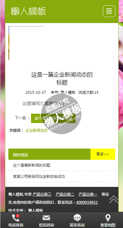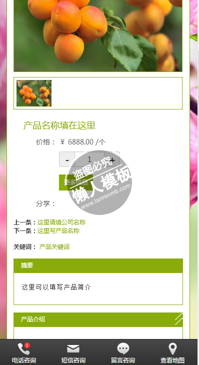 模板简介:该模板名称为【农产品种植手机PC端自适应响应式html5农业企业网站双模板下载】,大小是,文档格式为.,推荐使用打开,作品中的图片,文字等数据均可修改,图片请在作品中选中图片替换即可,文字修改直接点击文字修改即可,您也可以新增或修改作品中的内容,该模板来自用户分享,如有侵权行为请联系网站客服处理。欢迎来懒人模板【农业】栏目查找您需要的精美模板。