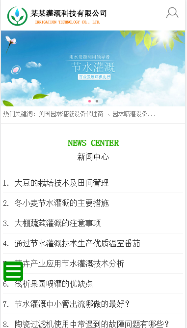 模板简介:该模板名称为【园林灌溉科技有限公司企业网站模板源码免费下载】,大小是,文档格式为.,推荐使用打开,作品中的图片,文字等数据均可修改,图片请在作品中选中图片替换即可,文字修改直接点击文字修改即可,您也可以新增或修改作品中的内容,该模板来自用户分享,如有侵权行为请联系网站客服处理。欢迎来懒人模板【仪器】栏目查找您需要的精美模板。
