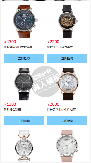 模板简介:该模板名称为【百达腕表手机PC端自适应响应式html5手表网站双模板下载】,大小是,文档格式为.,推荐使用打开,作品中的图片,文字等数据均可修改,图片请在作品中选中图片替换即可,文字修改直接点击文字修改即可,您也可以新增或修改作品中的内容,该模板来自用户分享,如有侵权行为请联系网站客服处理。欢迎来懒人模板【钟表】栏目查找您需要的精美模板。