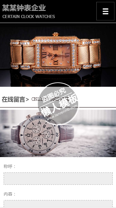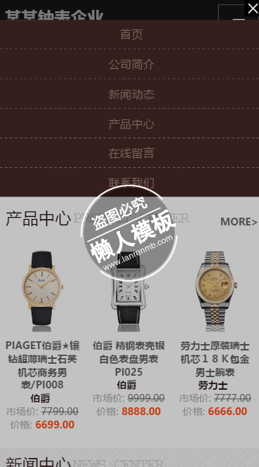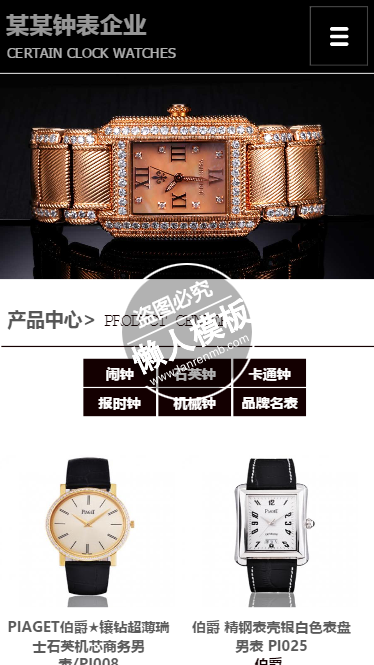 模板简介:该模板名称为【某钟表企业产品中心触屏版手机wap电子钟表网站模板免费下载】,大小是,文档格式为.,推荐使用打开,作品中的图片,文字等数据均可修改,图片请在作品中选中图片替换即可,文字修改直接点击文字修改即可,您也可以新增或修改作品中的内容,该模板来自用户分享,如有侵权行为请联系网站客服处理。欢迎来懒人模板【钟表】栏目查找您需要的精美模板。