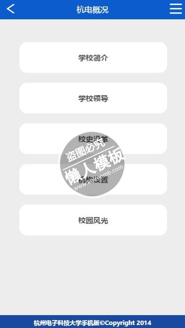 模板简介:该模板名称为【杭州电子科技学院触屏版自适应手机wap学校网站模板下载】,大小是,文档格式为.,推荐使用打开,作品中的图片,文字等数据均可修改,图片请在作品中选中图片替换即可,文字修改直接点击文字修改即可,您也可以新增或修改作品中的内容,该模板来自用户分享,如有侵权行为请联系网站客服处理。欢迎来懒人模板【学校】栏目查找您需要的精美模板。