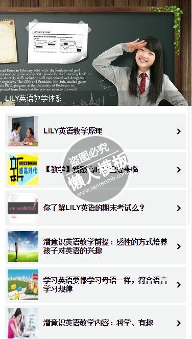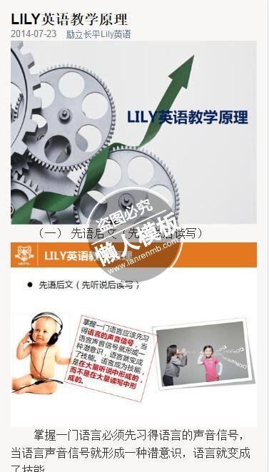 模板简介:该模板名称为【励立长平Lily英语触屏版自适应手机wap学校网站模板下载】,大小是,文档格式为.,推荐使用打开,作品中的图片,文字等数据均可修改,图片请在作品中选中图片替换即可,文字修改直接点击文字修改即可,您也可以新增或修改作品中的内容,该模板来自用户分享,如有侵权行为请联系网站客服处理。欢迎来懒人模板【学校】栏目查找您需要的精美模板。