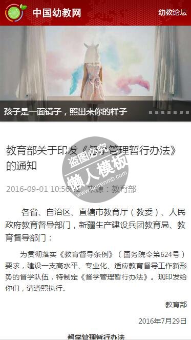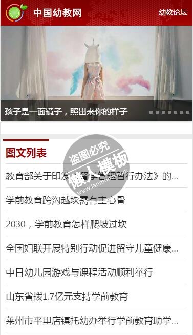 模板简介:该模板名称为【中国幼教网触屏版自适应手机wap教育网站模板下载】,大小是,文档格式为.,推荐使用打开,作品中的图片,文字等数据均可修改,图片请在作品中选中图片替换即可,文字修改直接点击文字修改即可,您也可以新增或修改作品中的内容,该模板来自用户分享,如有侵权行为请联系网站客服处理。欢迎来懒人模板【学校】栏目查找您需要的精美模板。