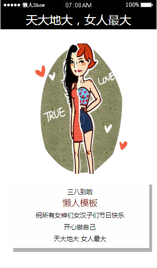 模板简介:该模板名称为【免费轻app微信HTML5移动场景天大地大女人最大应用模板源码制作】,大小是,文档格式为.,推荐使用打开,作品中的图片,文字等数据均可修改,图片请在作品中选中图片替换即可,文字修改直接点击文字修改即可,您也可以新增或修改作品中的内容,该模板来自用户分享,如有侵权行为请联系网站客服处理。欢迎来懒人模板【场景应用】栏目查找您需要的精美模板。
