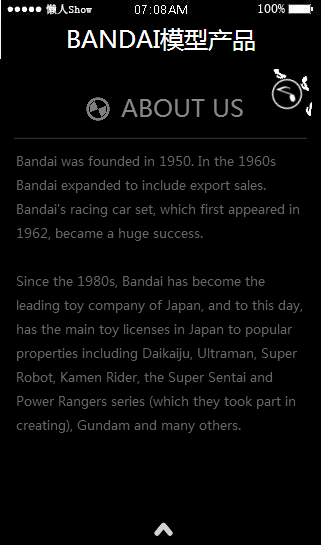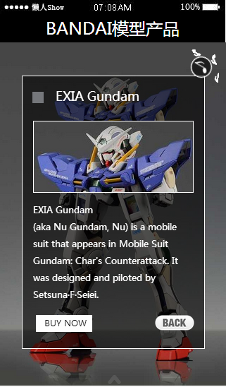 模板简介:该模板名称为【免费轻app微信HTML5移动场景BANDAI模型产品应用模板源码制作】,大小是,文档格式为.,推荐使用打开,作品中的图片,文字等数据均可修改,图片请在作品中选中图片替换即可,文字修改直接点击文字修改即可,您也可以新增或修改作品中的内容,该模板来自用户分享,如有侵权行为请联系网站客服处理。欢迎来懒人模板【服装】栏目查找您需要的精美模板。