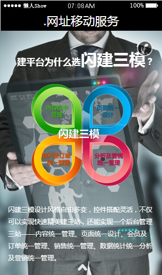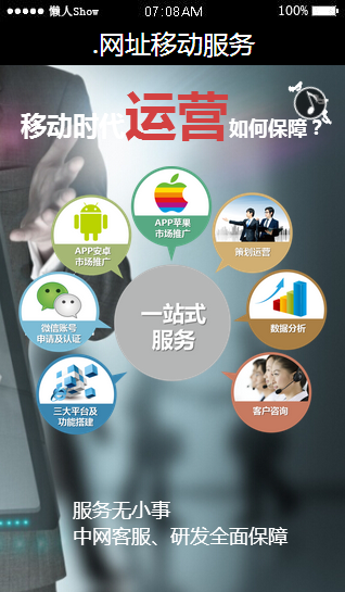 模板简介:该模板名称为【免费轻app微信HTML5移动场景网址移动端营销服务应用模板源码制作】,大小是,文档格式为.,推荐使用打开,作品中的图片,文字等数据均可修改,图片请在作品中选中图片替换即可,文字修改直接点击文字修改即可,您也可以新增或修改作品中的内容,该模板来自用户分享,如有侵权行为请联系网站客服处理。欢迎来懒人模板【科技】栏目查找您需要的精美模板。
