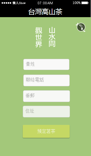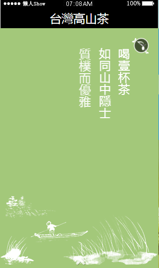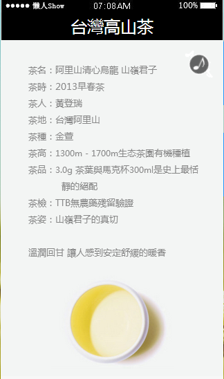 模板简介:该模板名称为【免费轻app微信HTML5移动场景台湾高山茶应用模板源码制作】,大小是,文档格式为.,推荐使用打开,作品中的图片,文字等数据均可修改,图片请在作品中选中图片替换即可,文字修改直接点击文字修改即可,您也可以新增或修改作品中的内容,该模板来自用户分享,如有侵权行为请联系网站客服处理。欢迎来懒人模板【食品】栏目查找您需要的精美模板。