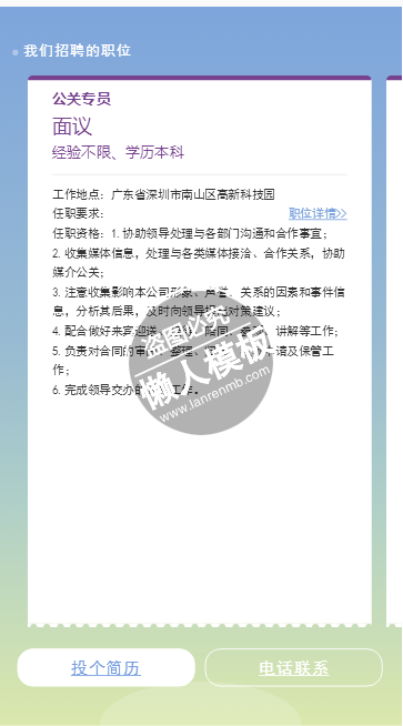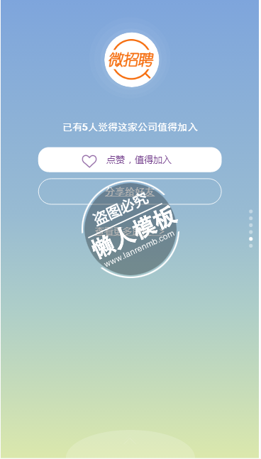 模板简介:该模板名称为【免费轻app微信HTML5同城微招聘场景秀应用模板源码制作】,大小是,文档格式为.,推荐使用打开,作品中的图片,文字等数据均可修改,图片请在作品中选中图片替换即可,文字修改直接点击文字修改即可,您也可以新增或修改作品中的内容,该模板来自用户分享,如有侵权行为请联系网站客服处理。欢迎来懒人模板【招聘】栏目查找您需要的精美模板。