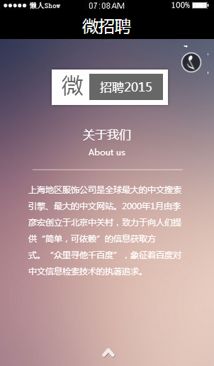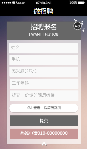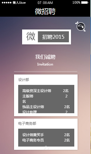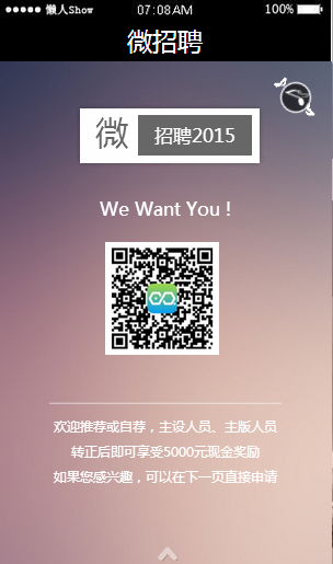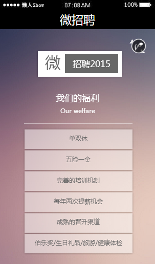 模板简介:该模板名称为【免费轻app微信HTML5移动场景微招聘应用模板源码制作】,大小是,文档格式为.,推荐使用打开,作品中的图片,文字等数据均可修改,图片请在作品中选中图片替换即可,文字修改直接点击文字修改即可,您也可以新增或修改作品中的内容,该模板来自用户分享,如有侵权行为请联系网站客服处理。欢迎来懒人模板【招聘】栏目查找您需要的精美模板。
