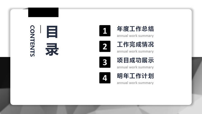 模板简介:该模板名称为【大气简洁工作报告PPT模板整套素材免费下载】,大小是1.09MB,文档格式为.PPTX,推荐使用Microsoft PPT/WPS打开,作品中的图片,文字等数据均可修改,图片请在作品中选中图片替换即可,文字修改直接点击文字修改即可,您也可以新增或修改作品中的内容,该模板来自用户分享,如有侵权行为请联系网站客服处理。欢迎来懒人模板【工作总结】栏目查找您需要的精美模板。