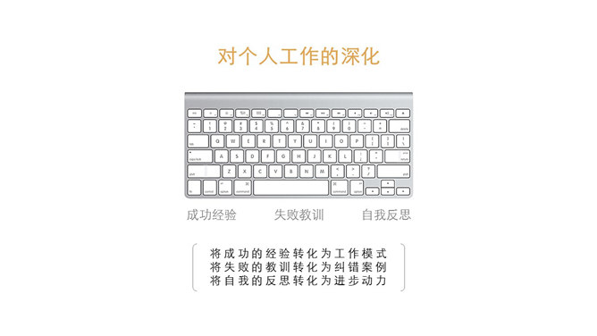 模板简介:该模板名称为【带指导文案的个人年终工作PPT模板整套素材免费下载】,大小是1.60MB,文档格式为..pptx,推荐使用Microsoft PPT/WPS打开,作品中的图片,文字等数据均可修改,图片请在作品中选中图片替换即可,文字修改直接点击文字修改即可,您也可以新增或修改作品中的内容,该模板来自用户分享,如有侵权行为请联系网站客服处理。欢迎来懒人模板【工作总结】栏目查找您需要的精美模板。
