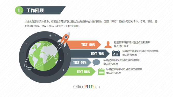 模板简介:该模板名称为【火箭一飞冲天工作总结汇报PPT模板整套素材免费下载】,大小是2.03MB,文档格式为..pptx,推荐使用Microsoft PPT/WPS打开,作品中的图片,文字等数据均可修改,图片请在作品中选中图片替换即可,文字修改直接点击文字修改即可,您也可以新增或修改作品中的内容,该模板来自用户分享,如有侵权行为请联系网站客服处理。欢迎来懒人模板【工作总结】栏目查找您需要的精美模板。