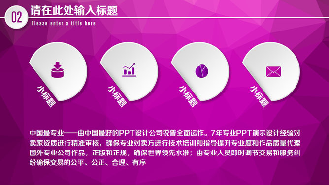 模板简介:该模板名称为【紫色微立体年终工作总结PPT模板整套素材免费下载】,大小是7.28MB,文档格式为..pptx,推荐使用Microsoft PPT/WPS打开,作品中的图片,文字等数据均可修改,图片请在作品中选中图片替换即可,文字修改直接点击文字修改即可,您也可以新增或修改作品中的内容,该模板来自用户分享,如有侵权行为请联系网站客服处理。欢迎来懒人模板【工作总结】栏目查找您需要的精美模板。