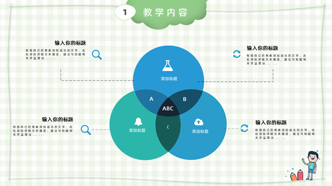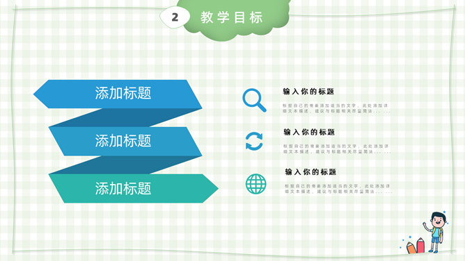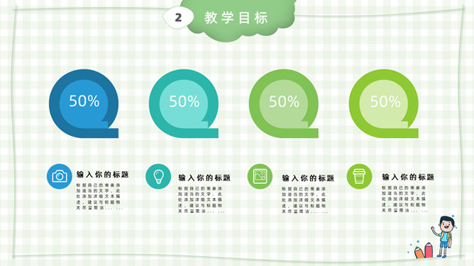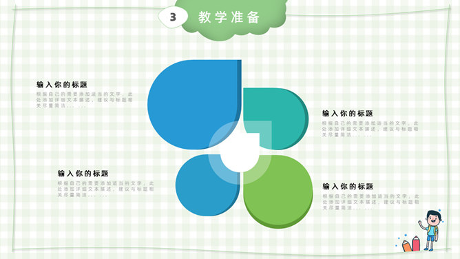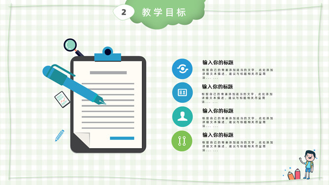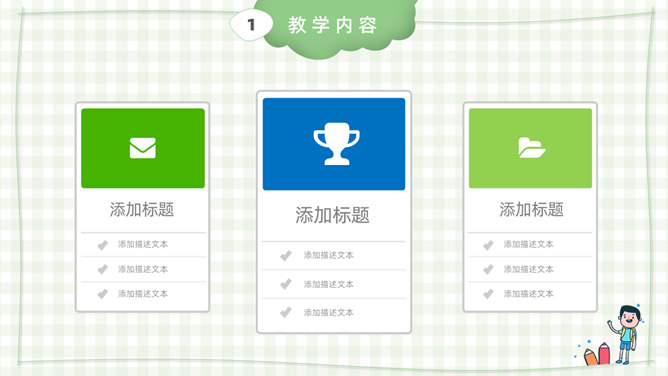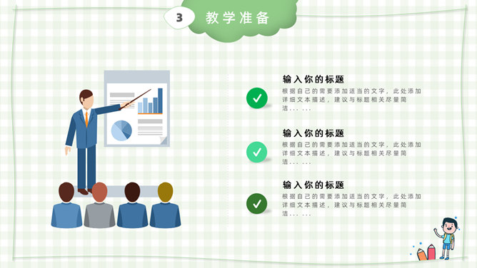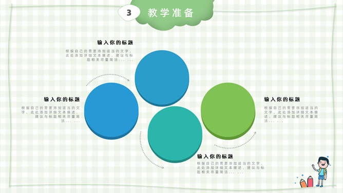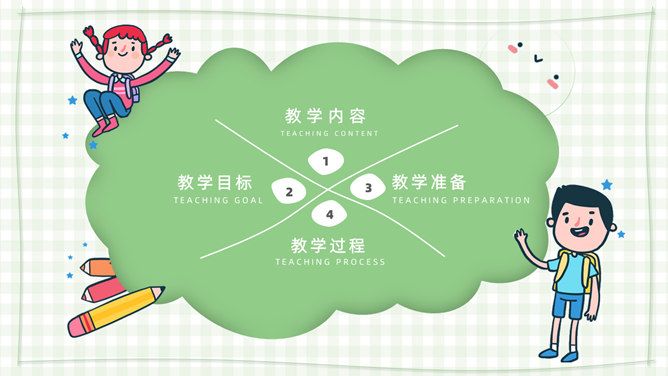 模板简介:该模板名称为【卡通小学教师说课课件PPT模板整套素材免费下载】,大小是574KB,文档格式为.PPTX,推荐使用Microsoft PPT/WPS打开,作品中的图片,文字等数据均可修改,图片请在作品中选中图片替换即可,文字修改直接点击文字修改即可,您也可以新增或修改作品中的内容,该模板来自用户分享,如有侵权行为请联系网站客服处理。欢迎来懒人模板【教育课件】栏目查找您需要的精美模板。