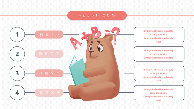 模板简介:该模板名称为【小熊卡通儿童读书分享PPT模板整套素材免费下载】,大小是0.97MB,文档格式为.PPTX,推荐使用Microsoft PPT/WPS打开,作品中的图片,文字等数据均可修改,图片请在作品中选中图片替换即可,文字修改直接点击文字修改即可,您也可以新增或修改作品中的内容,该模板来自用户分享,如有侵权行为请联系网站客服处理。欢迎来懒人模板【教育课件】栏目查找您需要的精美模板。