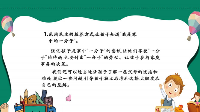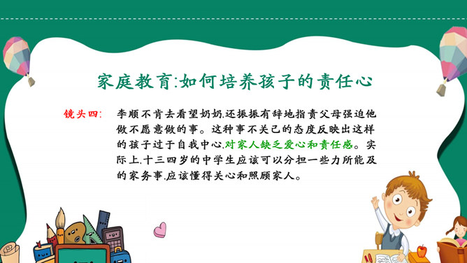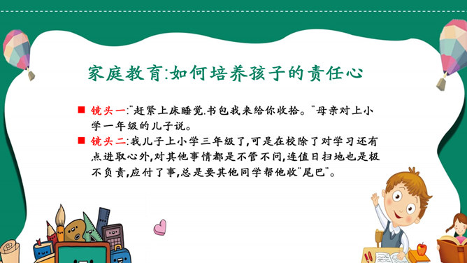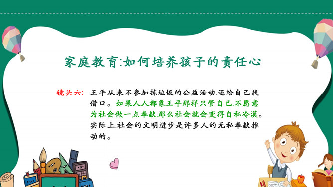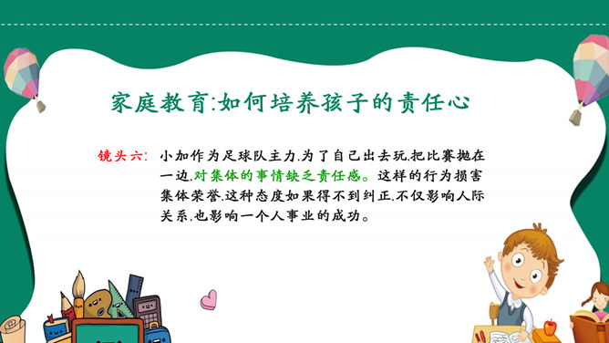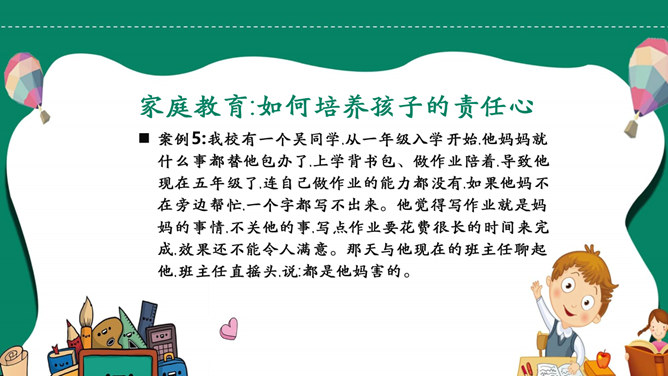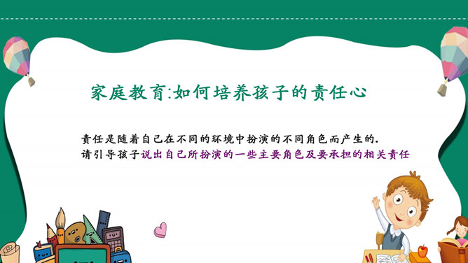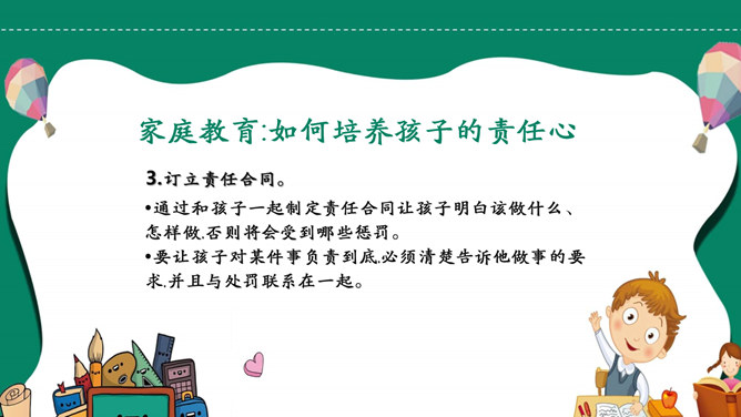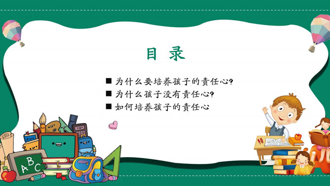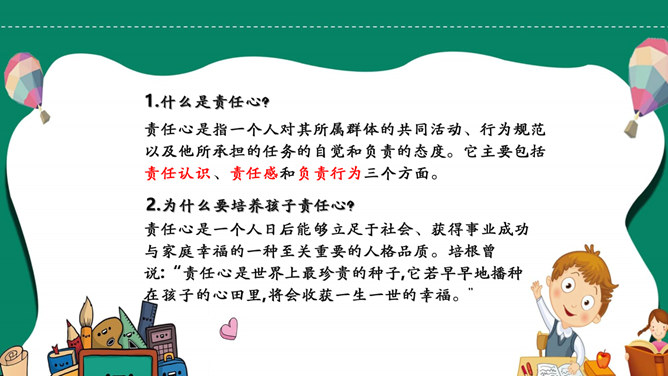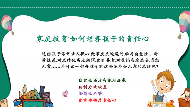 模板简介:该模板名称为【如何培养孩子的责任心PPT模板整套素材免费下载】,大小是419KB,文档格式为.PPTX,推荐使用Microsoft PPT/WPS打开,作品中的图片,文字等数据均可修改,图片请在作品中选中图片替换即可,文字修改直接点击文字修改即可,您也可以新增或修改作品中的内容,该模板来自用户分享,如有侵权行为请联系网站客服处理。欢迎来懒人模板【教育课件】栏目查找您需要的精美模板。