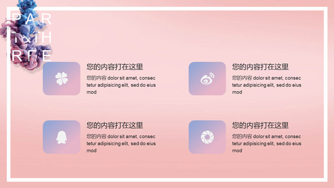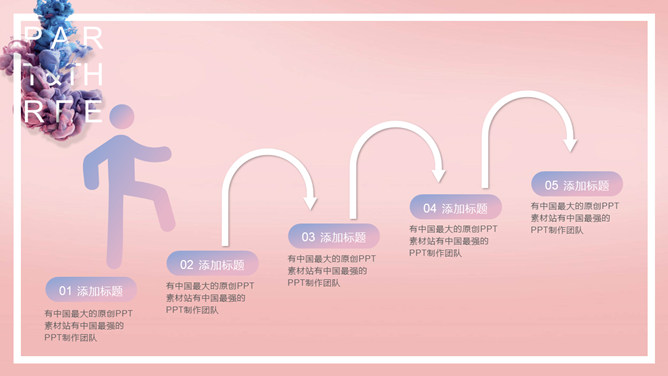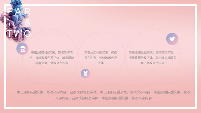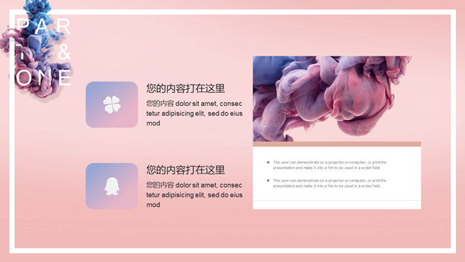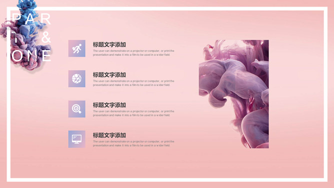 模板简介:该模板名称为【时尚艺术创意烟雾PPT模板整套素材免费下载】,大小是1.08MB,文档格式为.PPTX,推荐使用Microsoft PPT/WPS打开,作品中的图片,文字等数据均可修改,图片请在作品中选中图片替换即可,文字修改直接点击文字修改即可,您也可以新增或修改作品中的内容,该模板来自用户分享,如有侵权行为请联系网站客服处理。欢迎来懒人模板【企业宣传】栏目查找您需要的精美模板。