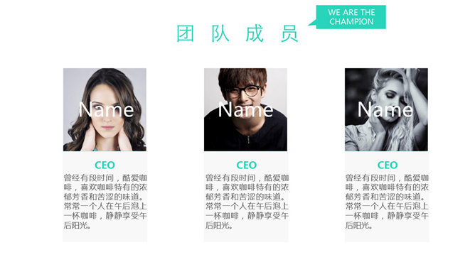 模板简介:该模板名称为【时尚扁平化团队介绍PPT模板整套素材免费下载】,大小是2.37MB,文档格式为..pptx,推荐使用Microsoft PPT/WPS打开,作品中的图片,文字等数据均可修改,图片请在作品中选中图片替换即可,文字修改直接点击文字修改即可,您也可以新增或修改作品中的内容,该模板来自用户分享,如有侵权行为请联系网站客服处理。欢迎来懒人模板【企业宣传】栏目查找您需要的精美模板。