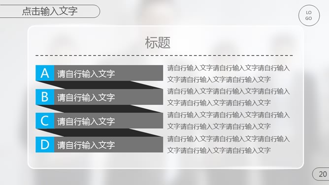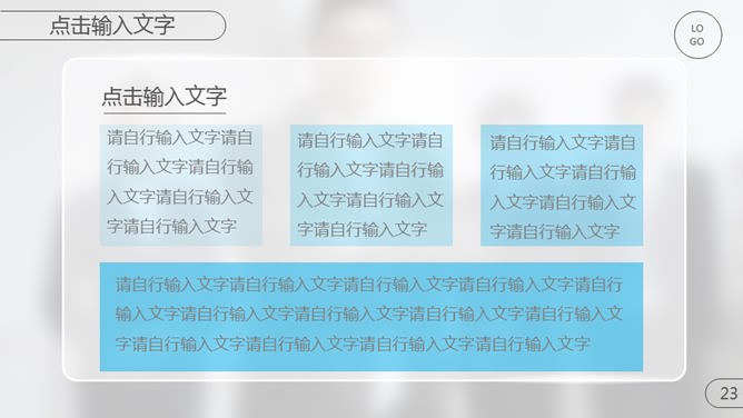 模板简介:该模板名称为【精美毛玻璃效果商务PPT模板整套素材免费下载】,大小是1.18MB,文档格式为..pptx,推荐使用Microsoft PPT/WPS打开,作品中的图片,文字等数据均可修改,图片请在作品中选中图片替换即可,文字修改直接点击文字修改即可,您也可以新增或修改作品中的内容,该模板来自用户分享,如有侵权行为请联系网站客服处理。欢迎来懒人模板【企业宣传】栏目查找您需要的精美模板。