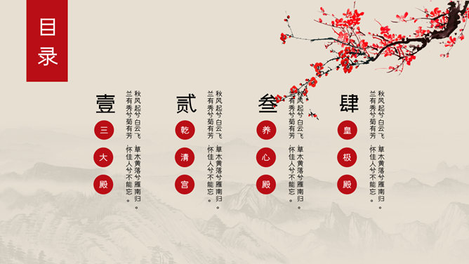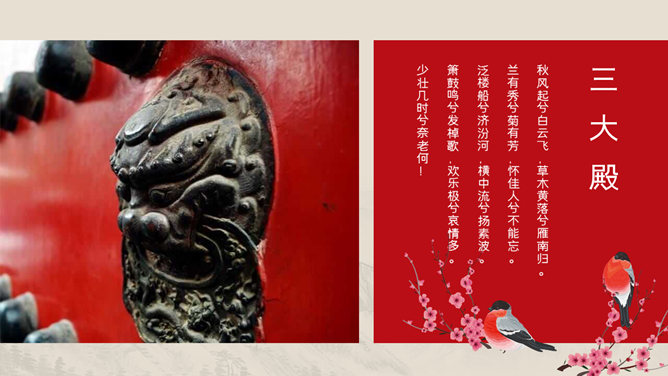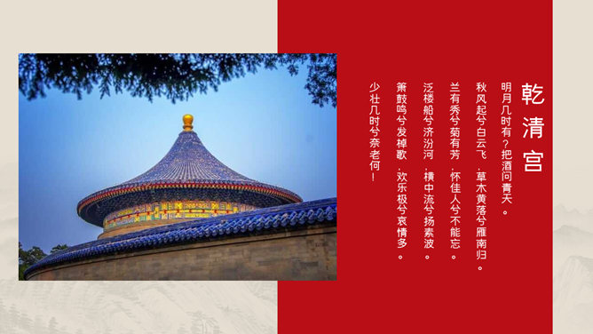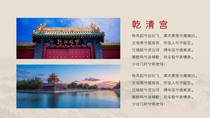 模板简介:该模板名称为【故宫建筑风景相册PPT模板整套素材免费下载】,大小是2.47MB,文档格式为.PPTX,推荐使用Microsoft PPT/WPS打开,作品中的图片,文字等数据均可修改,图片请在作品中选中图片替换即可,文字修改直接点击文字修改即可,您也可以新增或修改作品中的内容,该模板来自用户分享,如有侵权行为请联系网站客服处理。欢迎来懒人模板【相册图集】栏目查找您需要的精美模板。