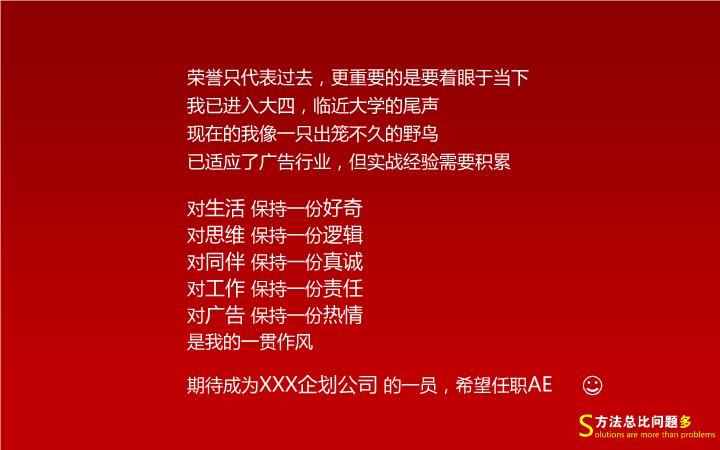 模板简介:该模板名称为【大红色广告设计个人简历述职竞聘PPT模板整套素材免费下载】,大小是6.98 MB,文档格式为.PPT,推荐使用Microsoft PPT/WPS打开,作品中的图片,文字等数据均可修改,图片请在作品中选中图片替换即可,文字修改直接点击文字修改即可,您也可以新增或修改作品中的内容,该模板来自用户分享,如有侵权行为请联系网站客服处理。欢迎来懒人模板【述职汇报】栏目查找您需要的精美模板。