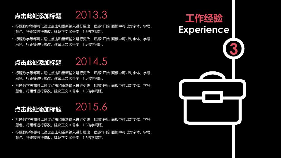 模板简介:该模板名称为【线条贯通式个人简历述职竞聘PPT模板整套素材免费下载】,大小是280.95 KB,文档格式为.PPT,推荐使用Microsoft PPT/WPS打开,作品中的图片,文字等数据均可修改,图片请在作品中选中图片替换即可,文字修改直接点击文字修改即可,您也可以新增或修改作品中的内容,该模板来自用户分享,如有侵权行为请联系网站客服处理。欢迎来懒人模板【述职汇报】栏目查找您需要的精美模板。